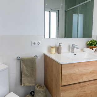 En el baño, se ha optado por cerámica blanca a media altura, que aporta luminosidad y amplitud. La ducha destaca por su cerámica tradicional en un vibrante azul, instalada verticalmente para dar una mayor sensación de altura y hacer que el espacio parezca más amplio. Las paredes restantes han sido pintadas con una pintura plástica especial para baños, que resiste la humedad y añade un toque moderno. El mueble suspendido en madera no solo aporta calidez, sino que también aligera visualmente el espacio.